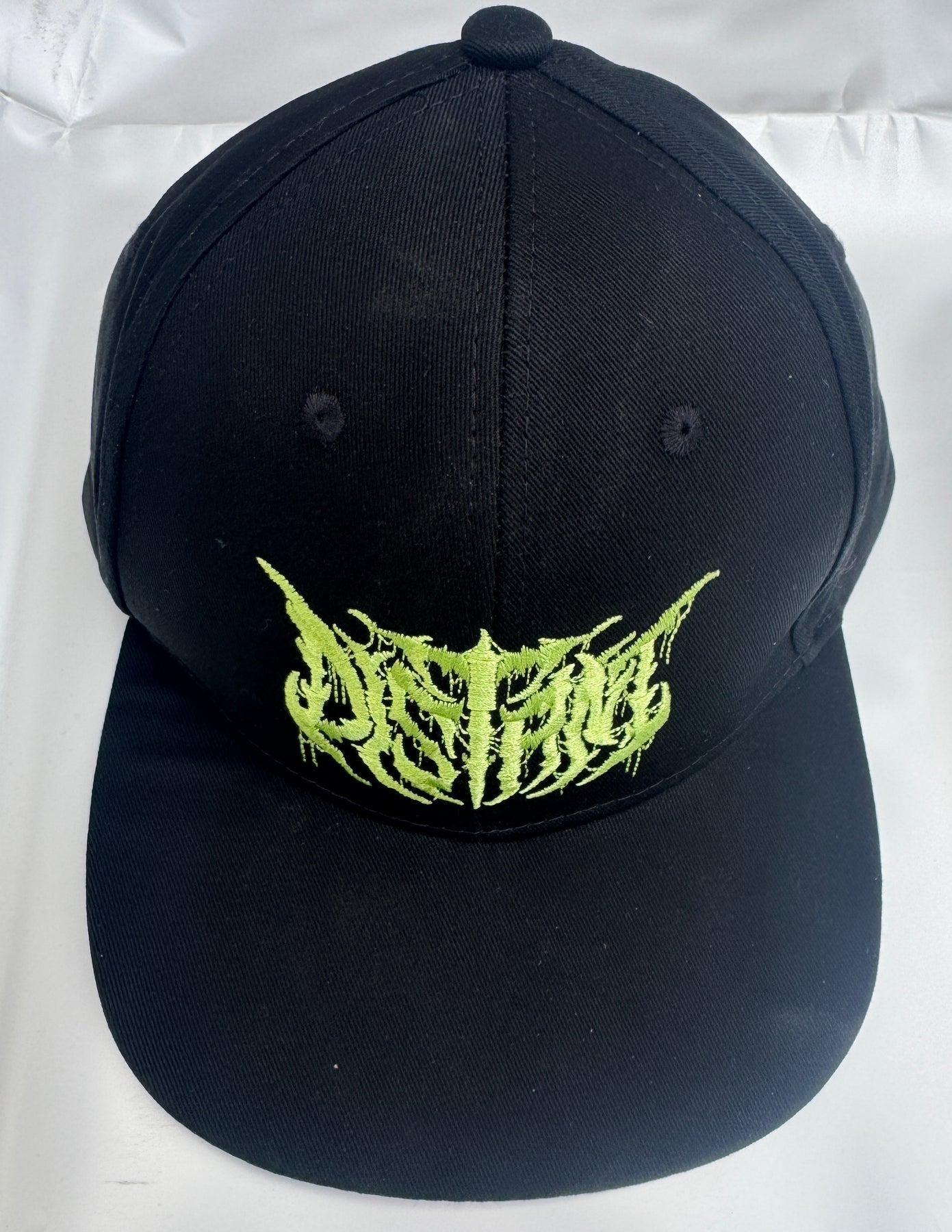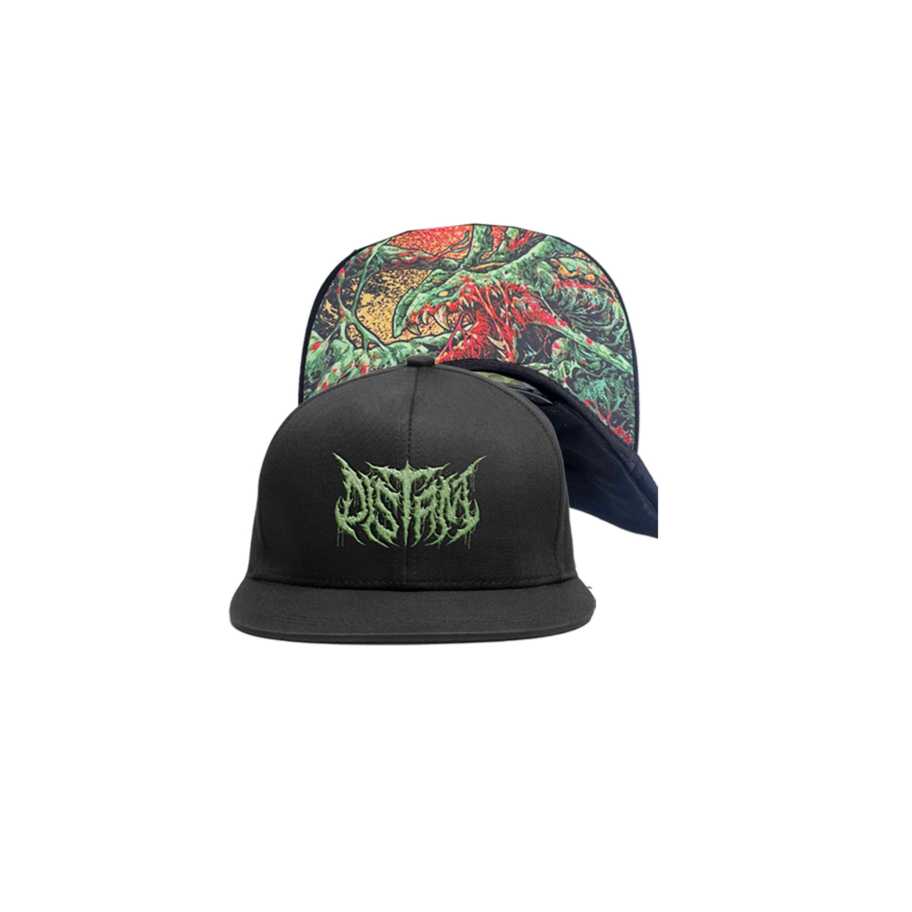 Black snapback. Distant embroidered logo. Artwork under brim print.