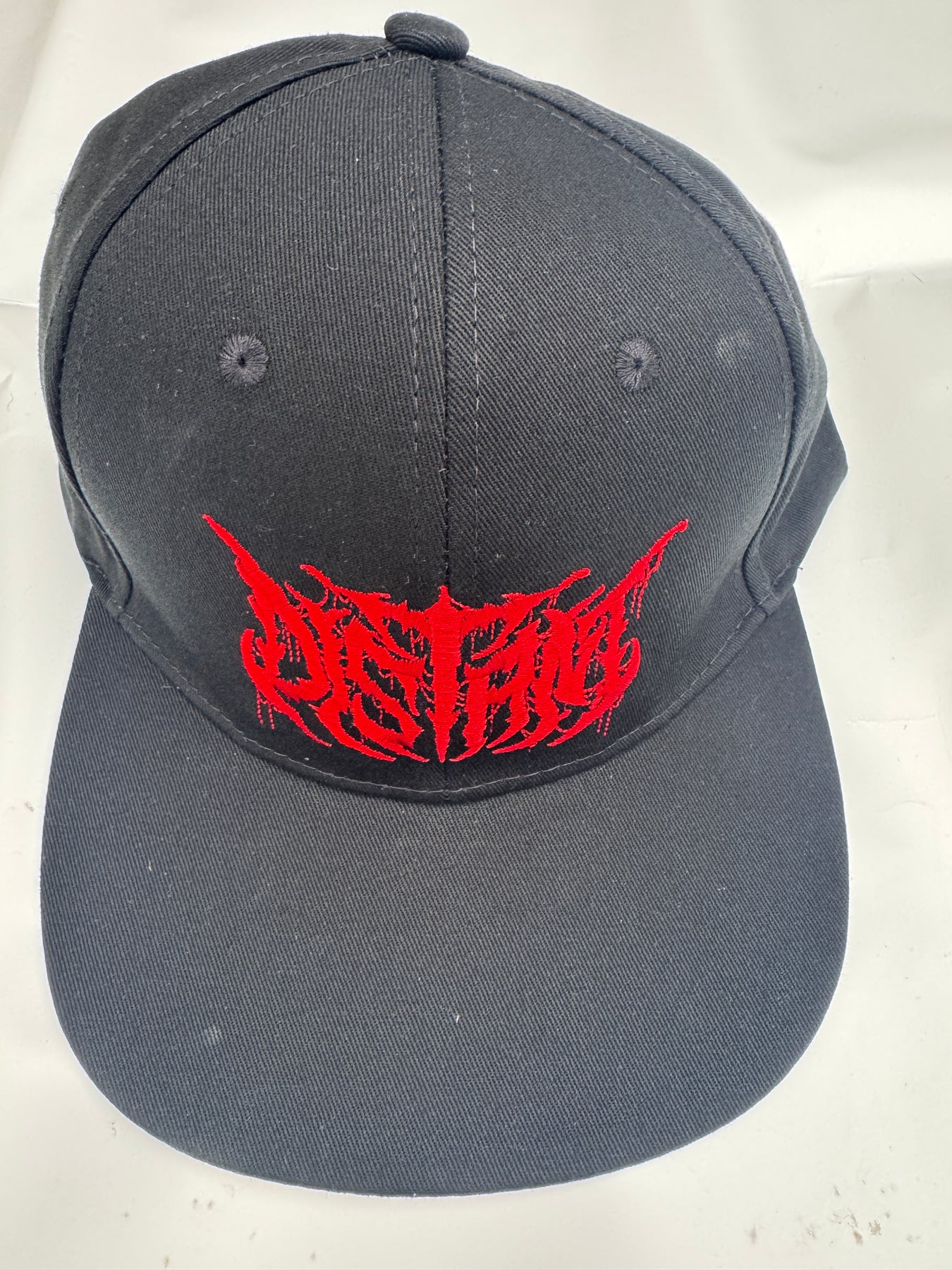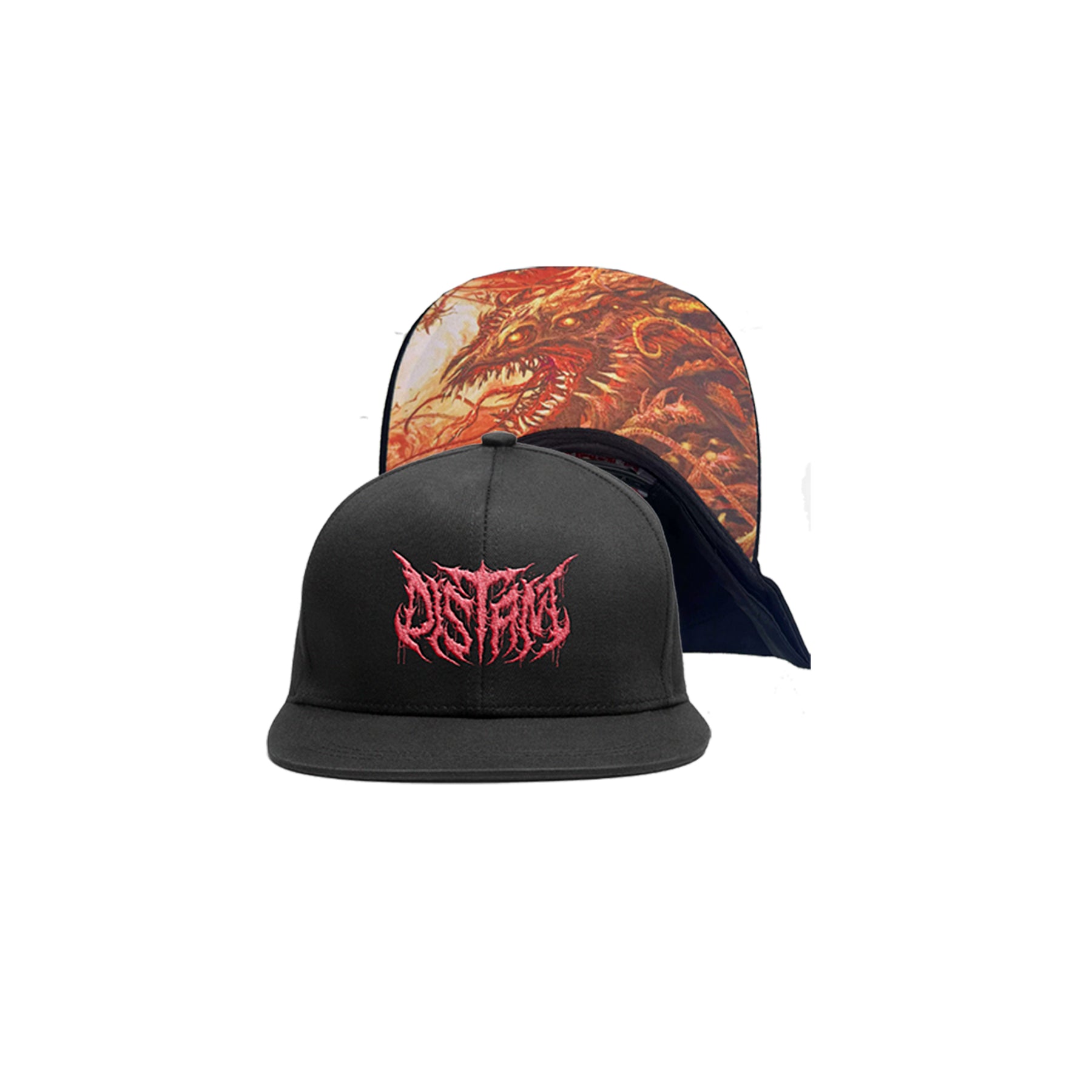 Black snapback. Distant embroidered logo. Artwork under brim print.
