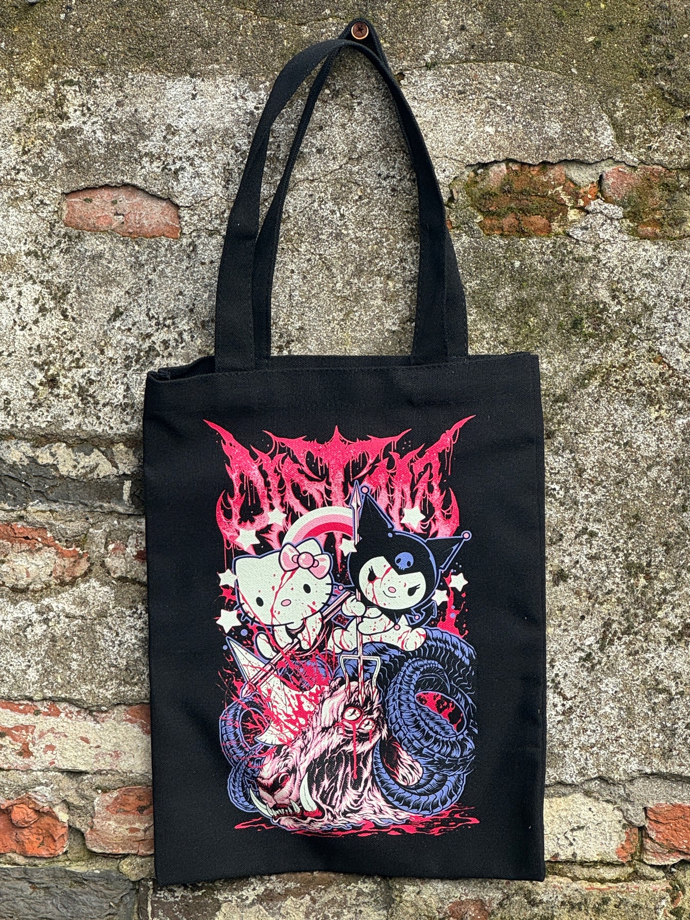 This black mini tote features the “Kitty” design printed on sturdy canvas. Perfect for shows, quick errands, or hauling the bare necessities when you don’t feel like dragging around a full-size bag.